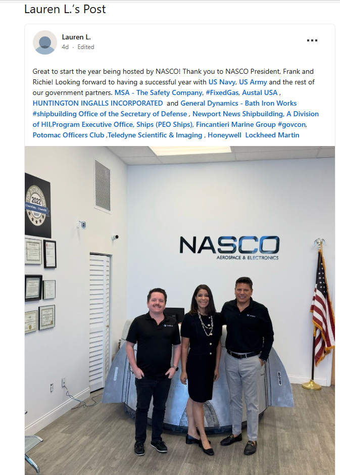 Nasco recently welcomed Lauren, the Senior Business Development Manager from MSA Safety Company, to their headquarters in St. Petersburg, Florida. This meeting aimed to strengthen partnerships and explore new opportunities for collaboration between the two organizations.Great to start the year being hosted by NASCO! Thank you to NASCO CEO, Frank and Richie! Looking forward to having a successful year with US Navy, US Army and the rest of our government partners. MSA – The Safety Company, #FixedGas, Austal USA , HUNTINGTON INGALLS INCORPORATED and General Dynamics – Bath Iron Works #shipbuilding Office of the Secretary of Defense , Newport News Shipbuilding, A Division of HII,Program Executive Office, Ships (PEO Ships), Fincantieri Marine Group #govcon, Potomac Officers Club ,Teledyne Scientific & Imaging , Honeywell Lockheed Martin